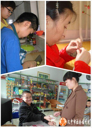 在福利院儿童所办公室,所长付宁首先向记者简单介绍了这方面的工作:“为了帮助孩子们逐步融入社会,2005年9月,在美国特殊教育专家马茉莉女士的指导下,院里成立了大龄障碍儿童职业技能培训基地,即‘鹰穴职业培训中心’,面向院内有特殊需要的14周岁以上残障青少年,通过日常生活、社交、文化及工作技能等培训,帮助他们克服自身残疾并充分发挥潜力,达到独立或半独立的自理能力。实行的单元式家庭养育方式也是陕南地区特有的,按年龄、性别、残疾程度由5-6人组成一个单元式家庭,每家一位‘爱心妈妈’负责其吃、穿、教育及日常管理。我们根据每个学生的实际情况,循序渐进开展培训。”