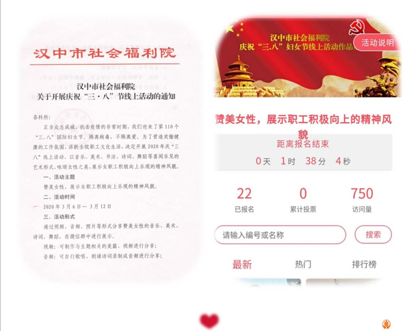 在全国上下众志成城、抗击疫情的关键时期,我们迎来了第110个“三·八”国际妇女节。在这个特别的节日里,为丰富文化生活,缓解工作压力,我院组织开展了“赞美女性,展示女职工积极向上精神风貌”庆“三八”主题系列活动,为这个特殊时期增添了一道别样的色彩。