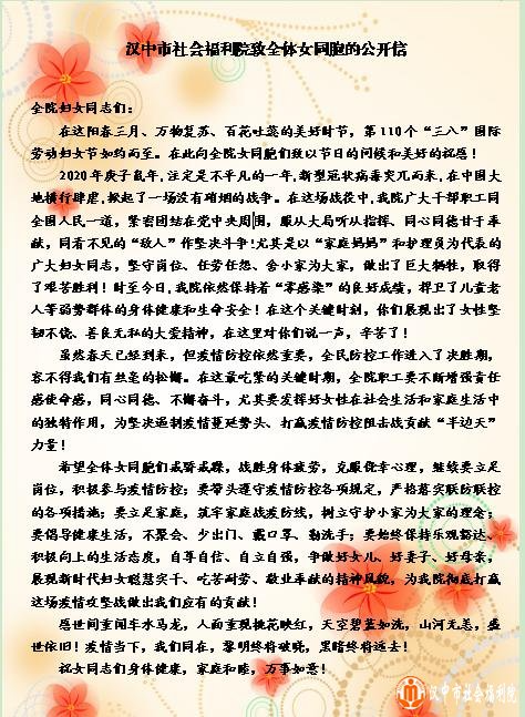 网络祝福暖人心。春天悄然而至,妇女节如约而至,在抗击疫情的特殊的时期,全院的女同胞们一改往日的柔弱,变身为一名阻击病毒的钢铁战士,坚守工作岗位,变得愈发坚强和勇敢,在“三八”妇女节来临之际,院里为半边天送来了《致全体女同胞的一封信》,除了表达对女性的关怀与赞美,更多的包含着对工作的肯定和今后的期许,希望全院上下同心同德,再接再厉,取得最后的胜利。