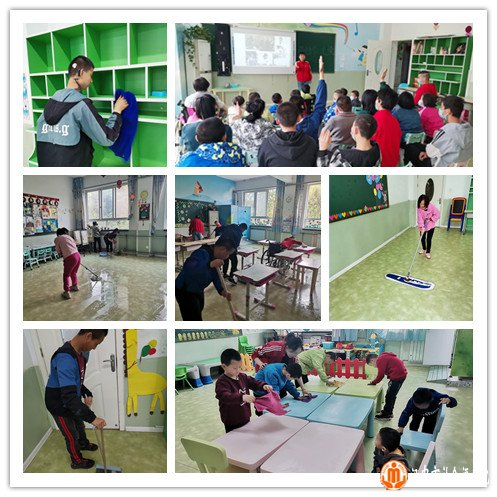 “劳动最光荣”主题班会上,老师以图文并茂的教学形式引导特教班儿童思考和发言,让他们知晓五一劳动节的由来,了解不同岗位劳动者对社会的奉献。最后,在老师指导下,孩子们相互分工协作,扫地、抹灰、整理物品,对整个教学区域开展了一次大清扫。
